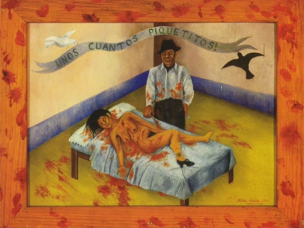 Painted in 1935, Unos cuantos piquetitos was Fridaβs response to the most devastating betrayal of her life: her husband Diego Rivera, having already slept with models, friends, and other women around the studio, had now slept with her sister, Cristina. Her confidante. Her blood. Her other self.